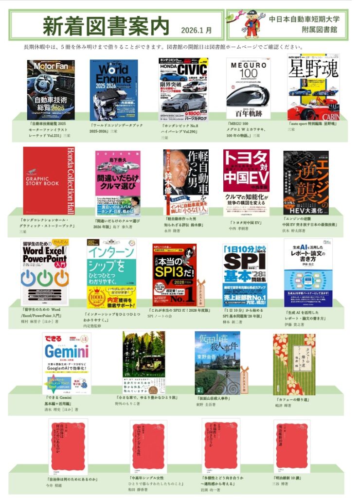 こちらからもご覧いただけます→新着資料 中日本自動車短期大学附属図書館